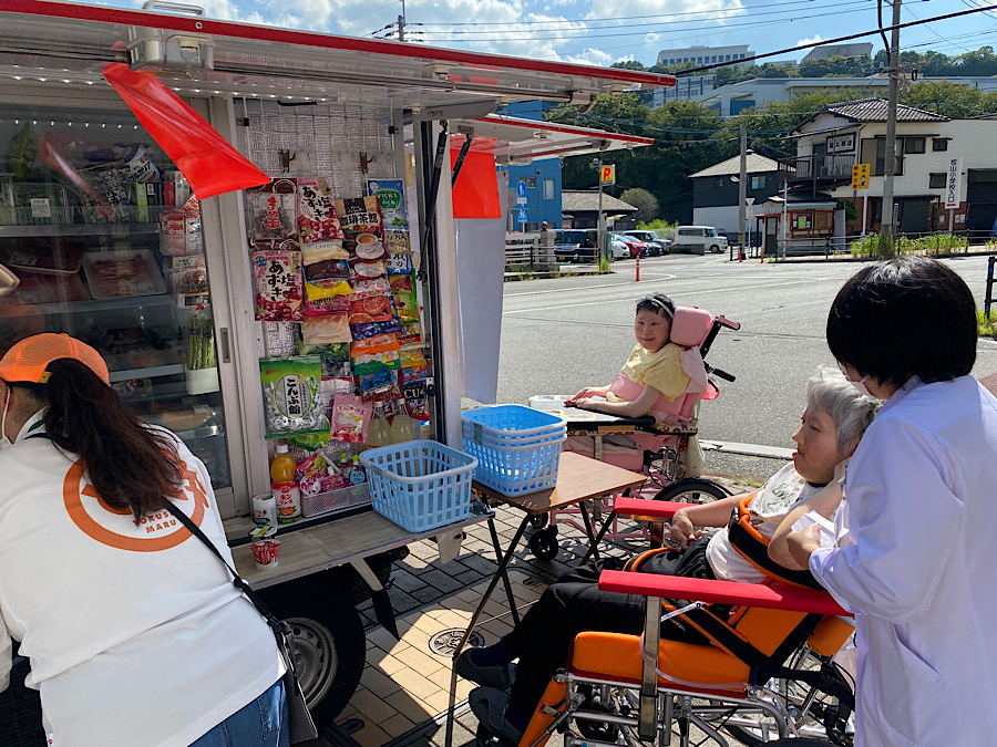 このとくし丸号はお菓子や飲み物、生鮮食品、日用品など色々な物がありとても便利な移動スーパーです!玄関前まで来てくれるので、入所者様が実際に見て選んで購入できます。当日になかったものは、予約をして次の週には持ってきていただけるので、とても助かっています。