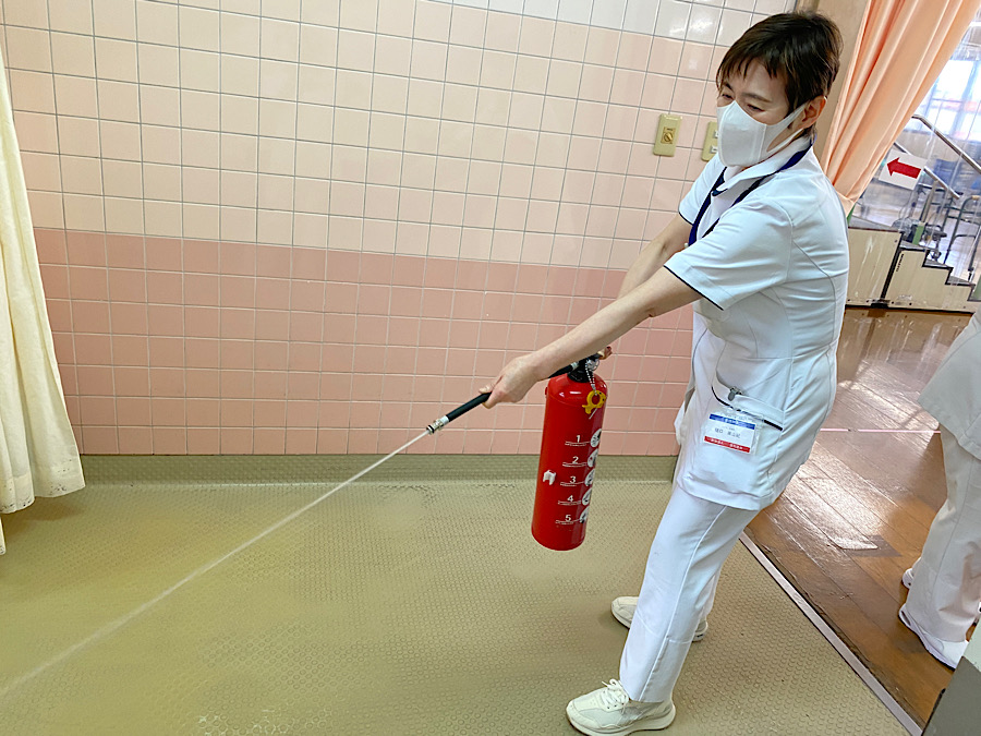 2025年11月11日10月31日に院内消防訓練を行いました。もしも火災が発生した場合に、職員が迅速に初期消火、通報、避難誘導を的確に行うための訓練です。今回は夜勤時に火災が起こった想定での訓練でした。