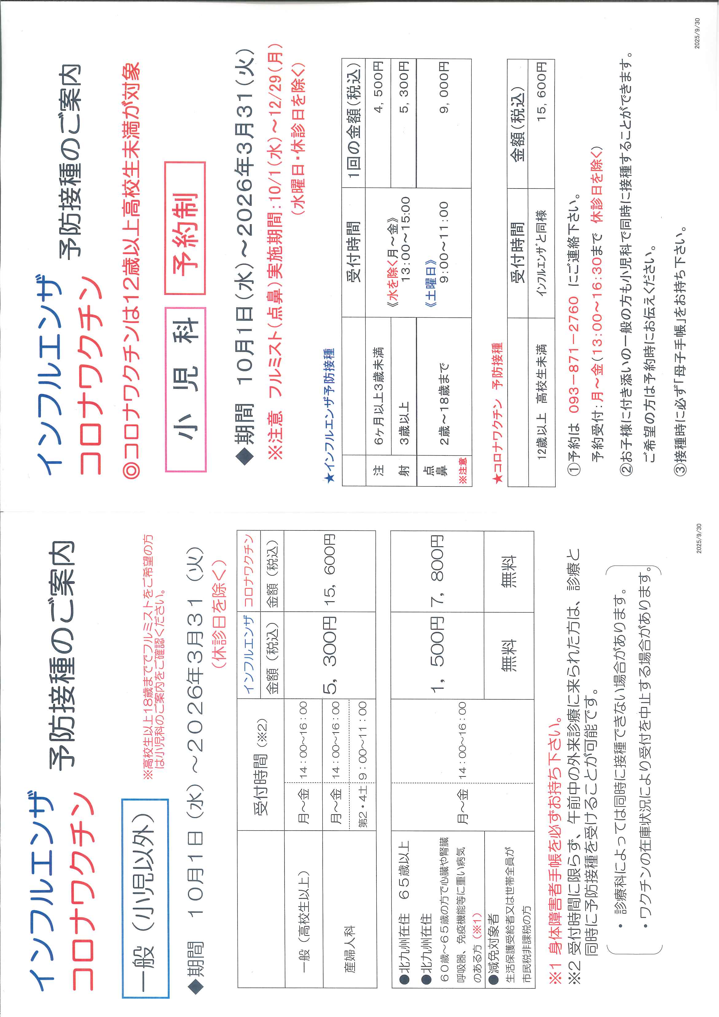 2025年度インフルエンザ及びコロナワクチン予防接種は10/1より開始致します。